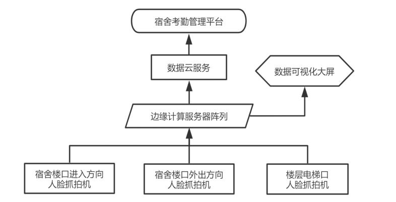 基于本校宿舍基本情況,結(jié)合學(xué)校運(yùn)營(yíng)管理模式,將宿舍考勤系統(tǒng)軟硬件模塊按照如下架構(gòu)圖部署。綜合樓大門(mén)處出入兩方向根據(jù)樓道寬度分別安裝2-4個(gè)人臉識(shí)別抓拍機(jī),6-11樓層電梯口各安裝2-3個(gè)人臉識(shí)別抓拍機(jī),抓拍機(jī)視頻圖像數(shù)據(jù)通過(guò)網(wǎng)絡(luò)路由設(shè)備實(shí)時(shí)匯總*宿管邊緣計(jì)算服務(wù)器陣列,服務(wù)器將視頻流信息中解析出的人臉數(shù)據(jù)與校方學(xué)生人臉庫(kù)信息進(jìn)行實(shí)時(shí)N比N快速驗(yàn)證,獲得學(xué)生身份信息,將對(duì)比結(jié)果實(shí)時(shí)顯示在數(shù)據(jù)可視化大屏上。結(jié)合學(xué)校考勤及宿舍管理邏輯,將各維度報(bào)表分析推送*云服務(wù)器,校方管理人員可通過(guò)宿舍考勤管理平臺(tái)獲取數(shù)據(jù)分析結(jié)果。